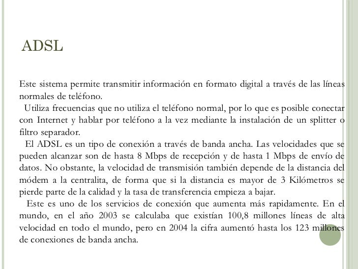 - DSL (normalmente del tipo Asymmetric Digital Subscriber Line o ADSL)